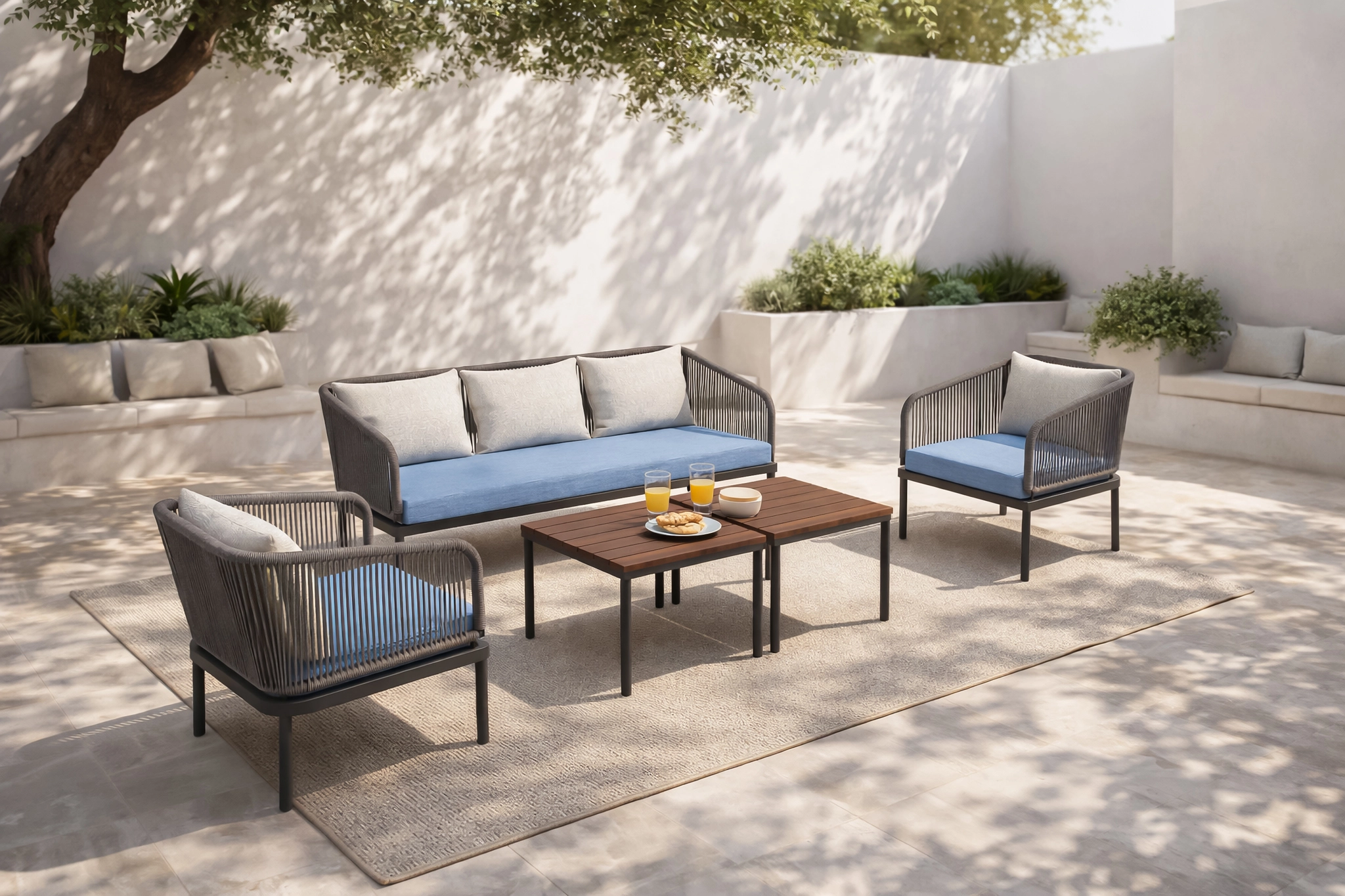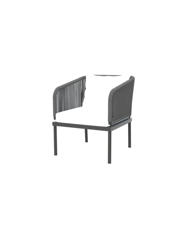 Hand-woven rope detailing adds airy elegance and reliable support, while powder-coated aluminum frames ensure strength without bulk.