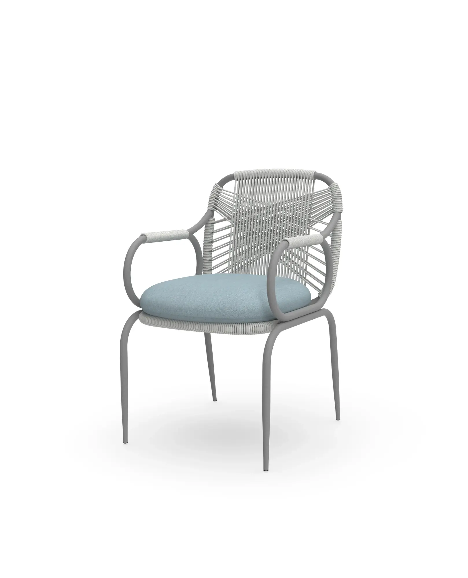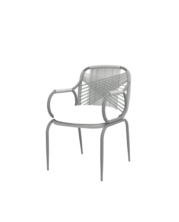 The sweeping armrests and rounded silhouette create an inviting, cocoon-like feel that’s both cozy and comfortable. The frame is constructed from durable, powder-coated aluminum, adding texture and visual depth.